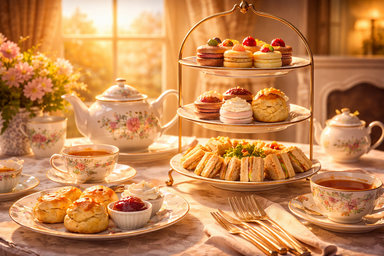 アフタヌーンティーに欠かせないお菓子には、外は香ばしく中はしっとりとしたスコーンや、サクサク食感のショートブレッドがあります。スコーンは、ジャムと南西イングランド生まれのクロテッドクリームをたっぷり添えて食べるのが定番です。