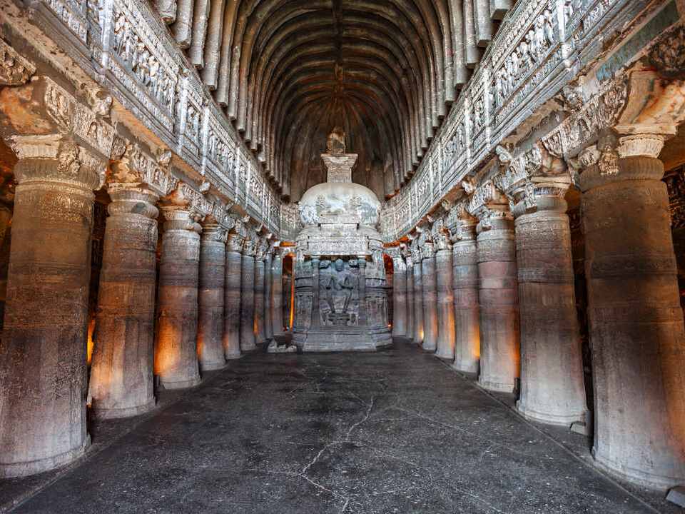 特に有名なのは、岩山を丸ごと掘り抜いて造られた第16窟「カイラーサナーター寺院」。巨大な彫刻建築で完成までに100年以上かかったといわれます。