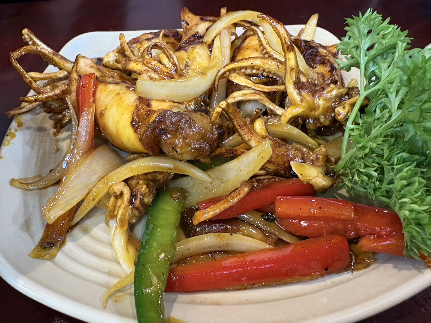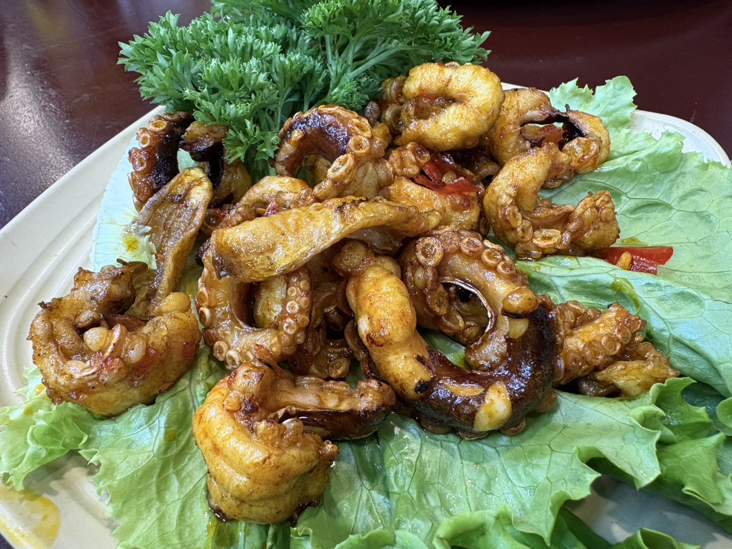タコをにんにく・唐辛子・魚醤で炒めることが多く、少し甘辛い味付けです。焼き目がしっかりとついていて香ばしかったです。