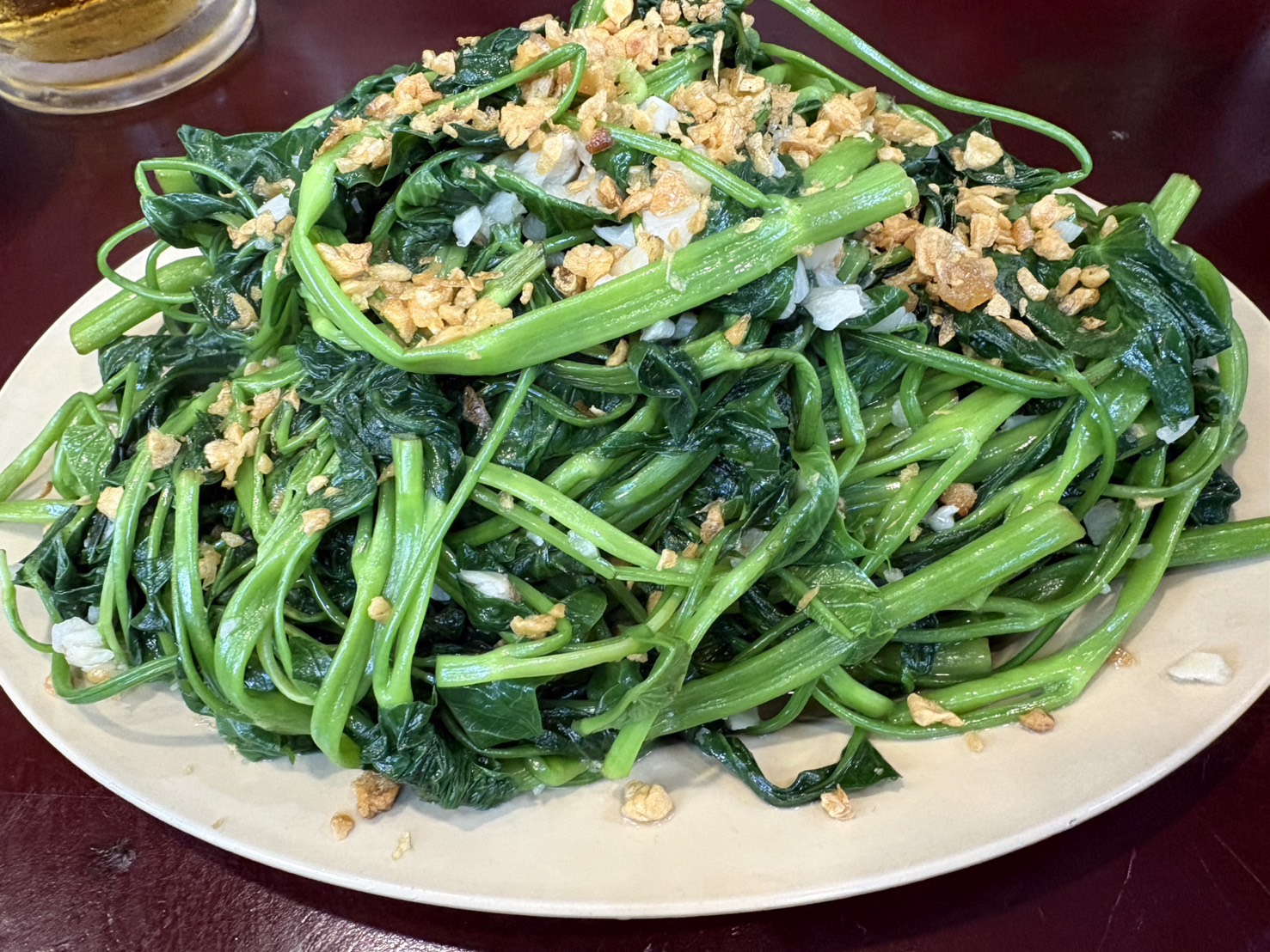 空心菜はベトナムで人気な野菜で強火でさっと炒めシャキシャキ食感を残すのが特徴で、にんにくがかなり効いていてビールによく合います。