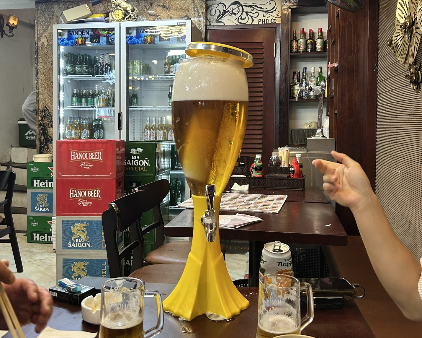 ベトナムの北部でよく飲まれる「生ビールタワー」スタイルで、中身は Bia hơi(ビアホイ) または Bia Tươiと呼ばれる軽いビールです。