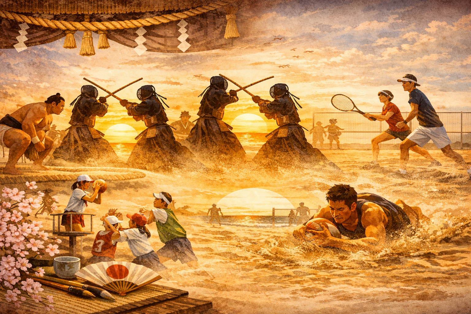 神事から始まった相撲、精神修養として磨かれてきた剣道、学校現場の工夫から生まれたポートボール、独自の発想で発展したソフトテニス、そして新しい舞台に挑戦するビーチラグビー。