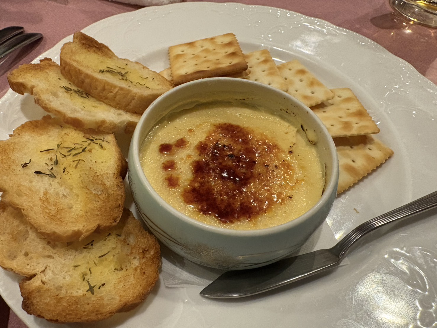 冷たいチーズにクラッカーとパンをフォンデュしていただきます!