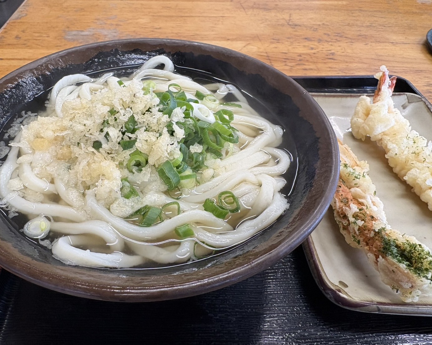 お盆を持って注文口でうどんを注文し、お会計をした後に天かすやネギなど自分が好きなようにトッピングできるセルフスタイルです。
